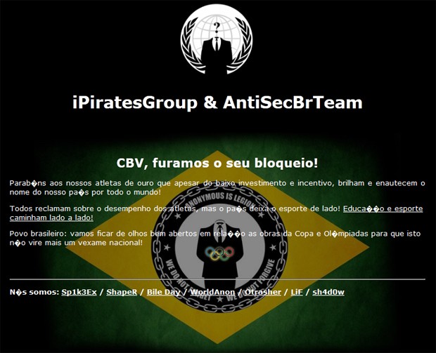 O grupo hacker ativista Anonymous invadiu o site da Confederação Brasileira de Vôlei (CBV) e deixou uma mensagem conta a falta de incentivo ao esporte no Brasil. A ação, que foi anunciada pelo Twitter, aconteceu após a derrota da seleção brasileira de vôlei para a Rússia na manhã deste domingo (12).