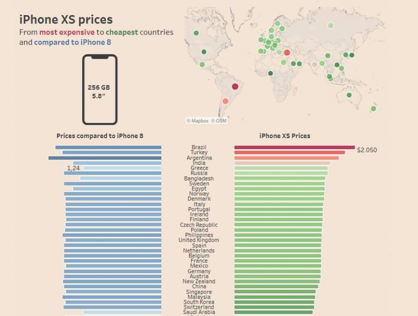 Foram analisados os preços em 40 países para chegar aos resultados apresentados. No Brasil, para adquirir um iPhone XS é necessário desembolsar o equivalente a US$ 2.050 (aproximadamente R$ 7.750).
