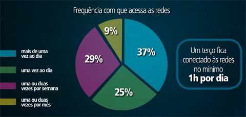A maioria dos brasileiros entrevistados (60%) já usa a internet há mais de três anos, sendo que a maioria deles (90%) já usam redes sociais. Classes A e B juntas têm a mesma participação no uso que a classe C (45%). Um terço dos entrevistados se mantém conectado às redes sociais pelo menos uma hora por dia – 37% deles afirmam acessar sites de redes sociais mais de uma vez por dia.