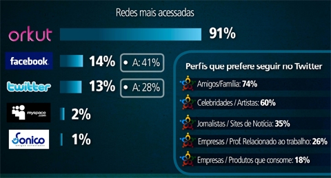 Com folga, o Orkut está em primeiro lugar entre as redes sociais mais acessadas pelos brasileiros. Segundo estudo do Ibope realizado em setembro, 91% dos 8.561 entrevistados de 11 regiões metropolitanas do Brasil é membro desta rede social. Para 82%, a primeira rede social acessada foi o Orkut. No entanto, 50% dos usuários acessam menos o Orkut do que antes, o que mostra que outras redes sociais, como Twitter e Facebook, ganham espaço na vida do brasileiro.
