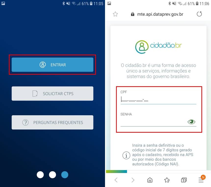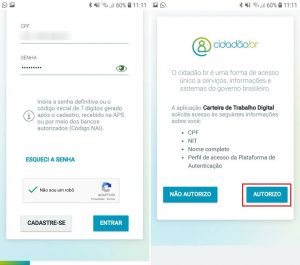 3. Na última tela, toque em “Entrar” e, realize o login ou faça um cadastro no site “cidadão.br”. Caso tenha um cadastro e não se lembre da senha, é recomendado usar o site do “cidadão.br” no PC para redefini-la;