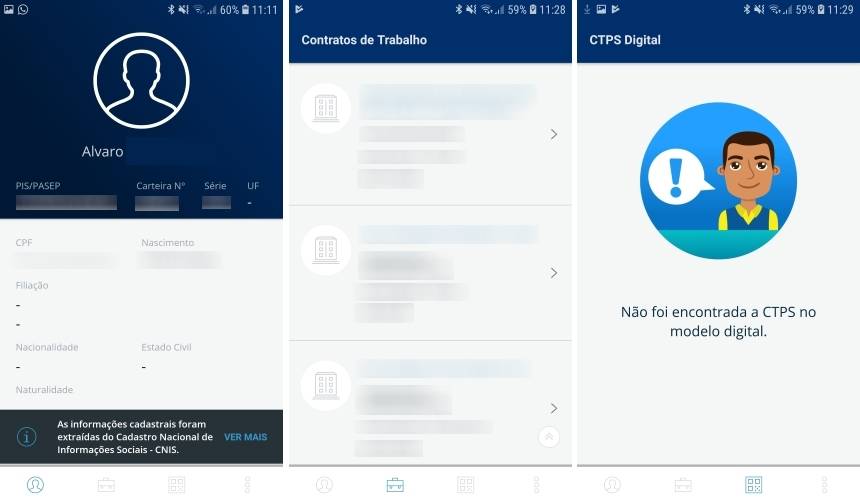 A partir deste momento, você já deve ter o acesso a sua carteira de trabalho digital. Na primeira aba do app, você verá informações como o número de seu PIS, CPF e da carteira. Já a segunda aba do aplicativo, traz informações sobre as empresas pelas quais você passou. A terceira aba, só carrega informações que foram incluídas na carteira digital, enquanto a última opção traz apenas o menu de ajuda do app.