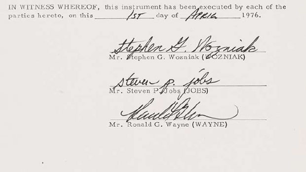 O contrato assinado por Steve Jobs, Ronald Wayne e Stephen Wozniak em 1º de abril 1976 para fundar a Apple será leiloado no dia 13 de dezembro em Nova York, anunciou nesta segunda-feira (28) a casa Sotheby’s, que avaliou o documento entre US$ 100 mil e US$ 150 mil.