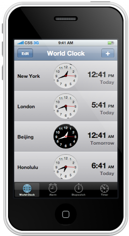 Mas você ainda não viu nada! Os ícones são bonitos, mas e o aparelhos que vai “rodar” esses apps? É o que você vê aqui do lado: um iPhone inteiro feito em CSS3 (detalhe: os ponteiros dos relógios se mexem). Este trabalho primoroso é assinado por Jeff Batterton e ele conta que tudo começou com o projeto de um relógio feito unicamente com CSS, mas que depois a ideia deixou de ser original e ele precisou retrabalhá-la. Como o design final só foi testado no Chrome, a renderização que você vê nesta imagem, feita pelo Safari 5, ficou com algumas imperfeições. Isso reforça o argumento de quem afirma que os novos padrões da web ainda têm muito o que melhorar até poderem ser chamados de “padrões”