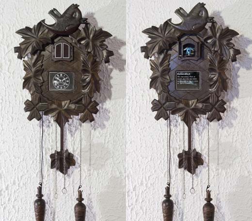 Enquanto um passarinho (azul) sai da janela, as mensagens aparecem em um LCD embutido no corpo do relógio. Configurado em Linux, o cuco tuiteiro exibe as mensagens usando uma versão do Flash, da Adobe, para dispositivos portáteis.