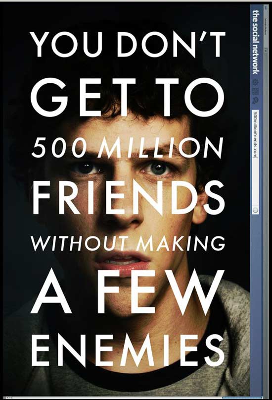 O poster de “The Social Network” foi lançado recentemente e traz a frase “you don´t get to 500 milion friends without making a few enemies”, ou “você não chega a 500 milhões de amigos sem fazer alguns inimigos”, em tradução livre.