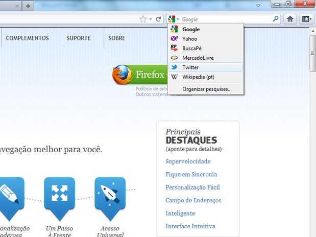 A Mozilla lançou nesta terça-feira um update do Firefox, que traz entre as principais novidades a opção de buscas no Twitter. As pesquisas por hashtags, nomes de usuário e tópicos está disponível em quatro línguas, sendo o português uma delas – inglês, esloveno e japonês completam a lista. A atualização está disponível para Windows, Mac, Linux, e Android.