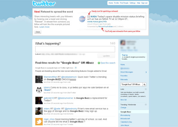 Desde o anúncio do Google Buzz na terça-feira (9), o novo serviço que dá um toque de rede social ao Gmail está entre os principais tópicos de discussão do Twitter. No dia seguinte ao lançamento, Google Buzz ainda era o segundo termo mais twittado no serviço de microblog.