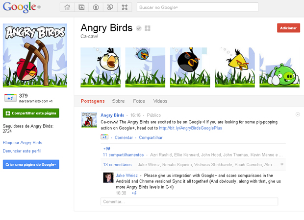 No Google+, o usuário “segue” seus contatos e os divide em círculos. Já estão disponíveis páginas de marcas como o jogo Angry Birds e o time Barcelona.