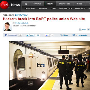 Um banco de dados da associação de policiais do Bay Area Rapid Transit (agência que gerencia o metrô) foi publicado na internet, com nomes, e-mails, endereços residenciais e senhas. Segundo a BBC, o grupo de hackers Anonymous anunciou no Twitter que dados de 102 policiais foram vazados.