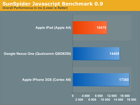 Quem também fez testes de performance com o iPad foi o AnandTech, mas contra o Nexus One, que possui um processador Snapdragon de 1GHz. O site focou-se no carregamento de sites e execução de JavaScript, em que o processador A4 deu vantagem à tablet com diferenças de 30% e 37,6%, respectivamente. Contudo, esse tipo de análise não é muito precisa: a Apple provavelmente otimizou o Safari para a tablet de uma forma que o navegador móvel do Android não possa ser aprimorado, julgando que ele também precisa oferecer suporte a aparelhos de menor performance.