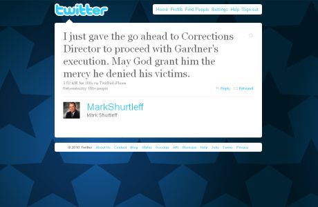 O tuite foi postado pelo procurador-geral às 0h02 no horário local (3h02 da manhã em Brasília) de seu iPhone, para ser lido pelos seus sete mil seguidores. Conforme noticiou a rede BBC, momentos depois de a mensagem ser publicada no site, Gardner era morto por um pelotão de fuzilamento. “Que Deus lhe conceda a clemência que ele negou a suas vítimas”, tuitou Shurtleff.