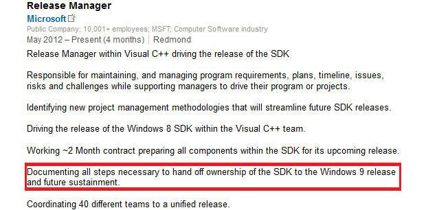 Nos perfis no Linkedin, pouco sobre o novo sistema é revelado. Apenas menções a nomes como Windows 9 e Windows.next estão presentes, indicando que podem tratar-se de codinomes para a futura encarnação do sistema operacional. Entre os profissionais envolvidos no desenvolvimento, há desenvolvedores e gerentes de produto.