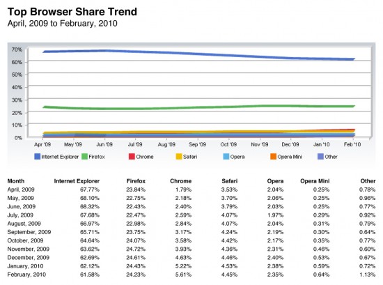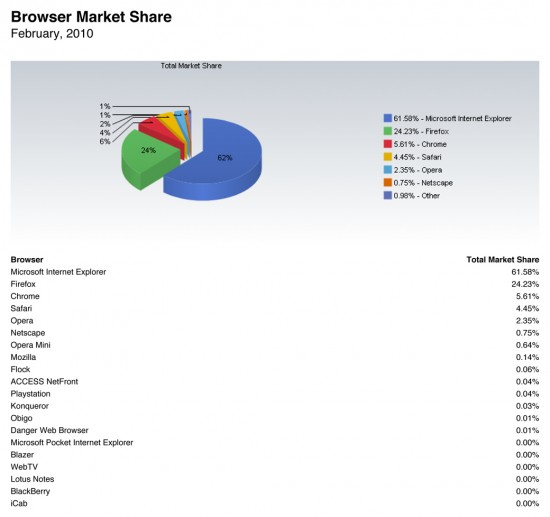 Hoje, a empresa liberou estatísticas referentes a fevereiro de 2010 (veja aqui as de janeiro), revelando que o Google Chrome foi o único dos grandes browsers a conquistar terreno no período, mostrando que o Firefox poderá nunca alcançar os tão almejados 25% de mercado.