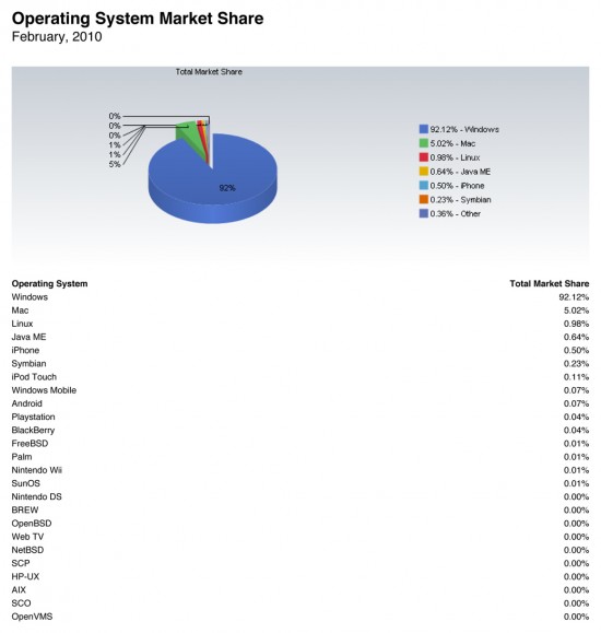 O Windows subiu de 92,00% para 92,12%, enquanto o Mac foi de 5,16% para 5,02%. O Linux caiu de 1,02% para 0,98%, o Java ME cresceu de 0,59% para 0,64% e o iPhone OS foi de 0,48% para 0,50%. O Symbian OS permaneceu praticamente estável, variando de 0,24% para 0,23%.