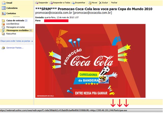 Um dos golpes usa a imagem da Coca-Cola e a marca da Fifa (imagem acima) para simular a promoção “Carregadores da Bandeira”. Ao colocar o mouse sobre a imagem, você percebe que o endereço que aparece na barra inferior (como apontam as flechas em vermelho na imagem acima) não tem qualquer relação com a Coca-Cola. Isso já seria motivo para um alerta, não? O link ainda aponta para um arquivo malicioso com extensão executável (.exe), que pode danificar seu computador ou roubar senhas. O remetente da mensagem aparece como “promocao@cocacola.com.br”.