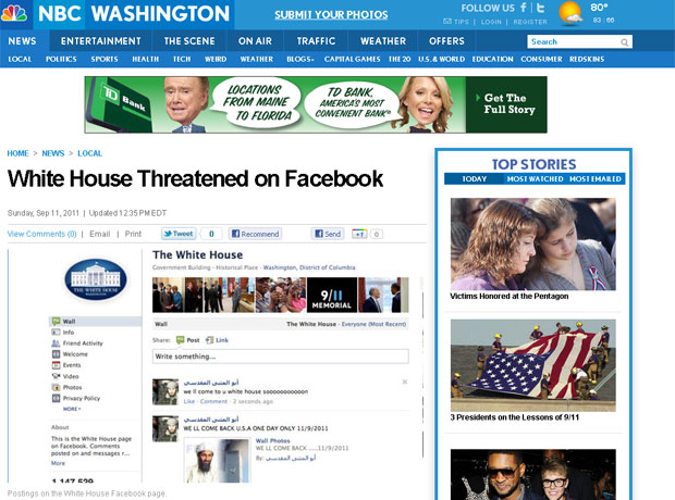 A reportagem traz uma cópia da página com as mensagens, que dizem: “Voltaremos, EUA, um só dia, 11/9/2011”, “Nós iremos a você Casa Branca logoooooooo” e “Nós voltaremos em 11/9/2011 para matar todos vocês”.