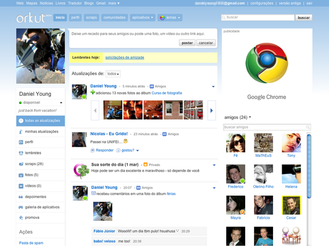 As novidades não param aí, segundo o blog no próximo mês a rede social terá novidades nas comunidades, além de novos limites de amigos (alguém conhece mais de mil pessoas?), fotos e vídeos. Agora nos resta saber se o Orkut vai realmente continuar lutando até o final, já que grande parte das pessoas pensa que a data de validade do serviço já se aproxima.