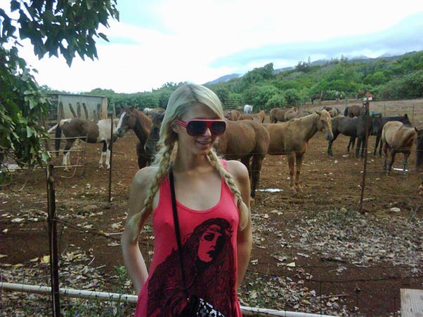 Na madrugada desta quarta-feira, 8, Paris Hilton postou fotos suas sem sutiã no Twitter. Nas imagens, a patricinha aparece andando a cavalo em um haras e compartilhou sua paixão pelo animal: ‘Eu amo cavalos! São animais lindos’, escreveu ela e, sua página no Twitter.