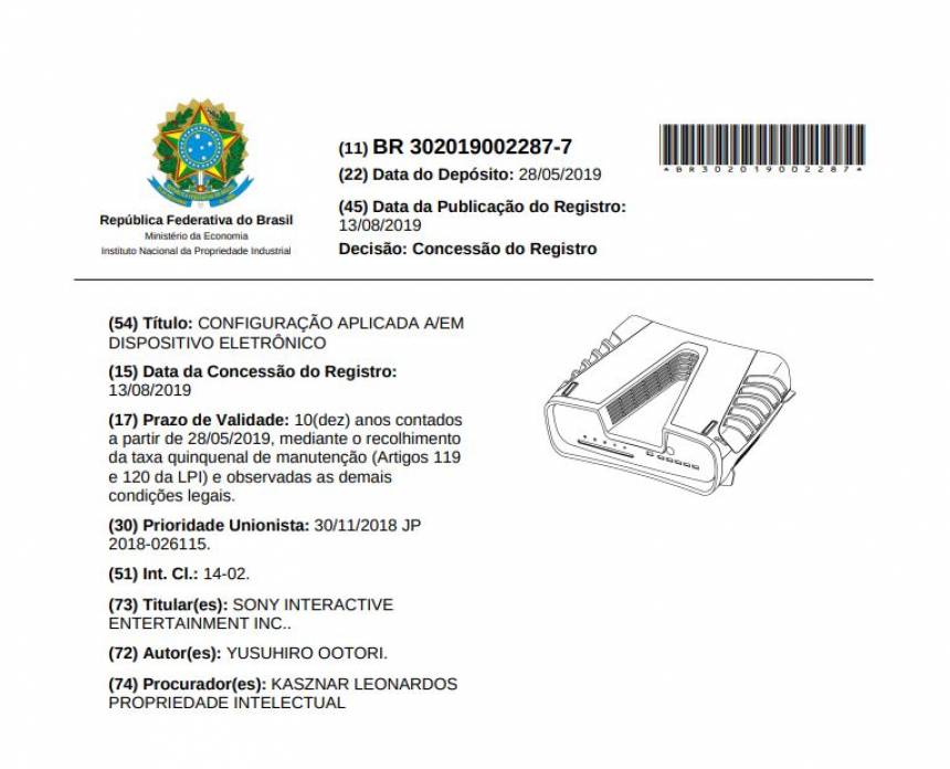 No Brasil, o mesmo design foi registrado e está disponível para consulta no site do INPI (Instituto Brasileiro de Propriedade Intelectual). A patente foi registrada na categoria 14.02, a mesma do Playstation 4 quando ele foi registrado no país.