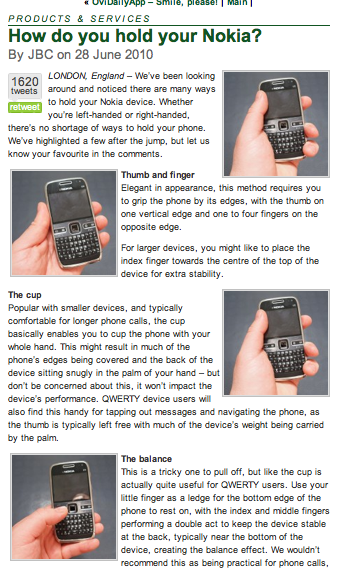 O novo iPhone 4 foi alvo de diversas reclamações mesmo antes de chegar ao consumidor final. Uma das principais críticas quanto à nova versão foi referente ao sinal do aparelho, que diminuía sigificativamente ao ser segurado com a mão esquerda. Aproveitando a enxurrada de reclamações que a Apple está levando, a Nokia decidiu fazer piada da situação e frisa que, ao contrário do iPhone 4, seus aparelhos podem ser segurados de qualquer maneira sem diminuir a qualidade da recepção do sinal.