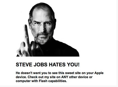 Pois o publicitário norte-americano Mat Bisher pegou uma carona nessa limitação e criou a campanha “Steve Jobs Hates You” (Steve Jobs te odeia). Ele criou uma ferramenta que pode ser inserida em sites com Flash e que, uma vez incorporada, mostra, em vez da caixa de erro tradicional (caso o dispositivo não tenha suporte a essa tecnologia), uma imagem do principal executivo da Apple com o dedo em riste e a frase acima.