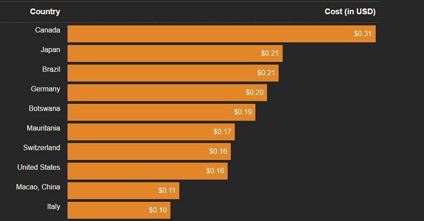 Como muita gente deve ter apostado, o “What Does My Site Cost?” mostra que Brasil figura entre os países onde é mais caro acessar uma página pelo celular. Ficando atrás apenas do Canadá e do Japão, onde os custos são de US$ 0,31 e US$ 0,21, respectivamente. Por aqui, o valor é de US$ 0,21, cerca de R$ 0,66. Confira os 10 primeiros colocados da lista: