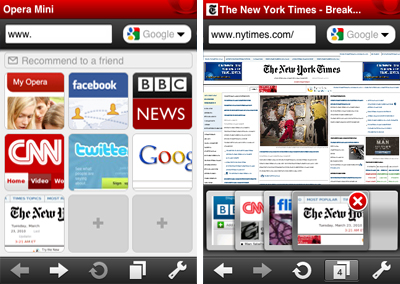 A interface do Opera Mini para o iPhone é idêntica às outras versões do navegador para outros dispositivos portáteis. Tudo começa com uma página inicial inteligente: como tradição dos navegadores Opera, o Mini conta com o Speed Dial, que é uma seleção de nove páginas para acesso rápido, que podem ser configuradas pelo usuário.