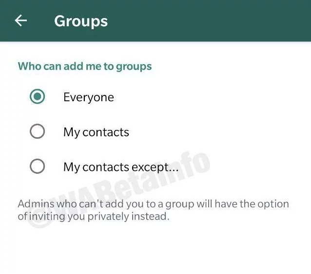 A partir dessa atualização, será possível gerenciar isso abrindo Configurações do WhatsApp> Conta> Privacidade> Grupos. Ao abrir a seção, você pode escolher “Todos”, permitindo que todo mundo te coloque em grupos sem autorização para isso, como é atualmente; “Meus contatos”, em que você pode ser adicionado somente pela sua lista de contatos; e “Meus contatos, exceto”, que, como o próprio nome diz, autoriza que seus conhecidos te coloquem em certas comunidades, mas com exceção de alguns nomes.
