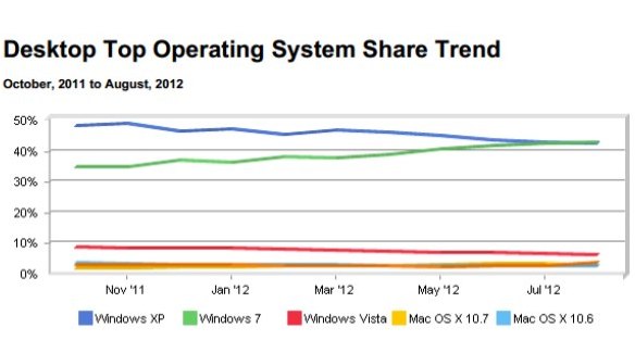 Em março de 2012, o Windows XP esteve pela primeira vez presente em menos de 50% das máquinas que rodam WIndows, segundo a NetApplications. Os analistas estimavam que a inversão da liderança com Windows 7 aconteceria em maio, mas só ocorreu três meses depois.